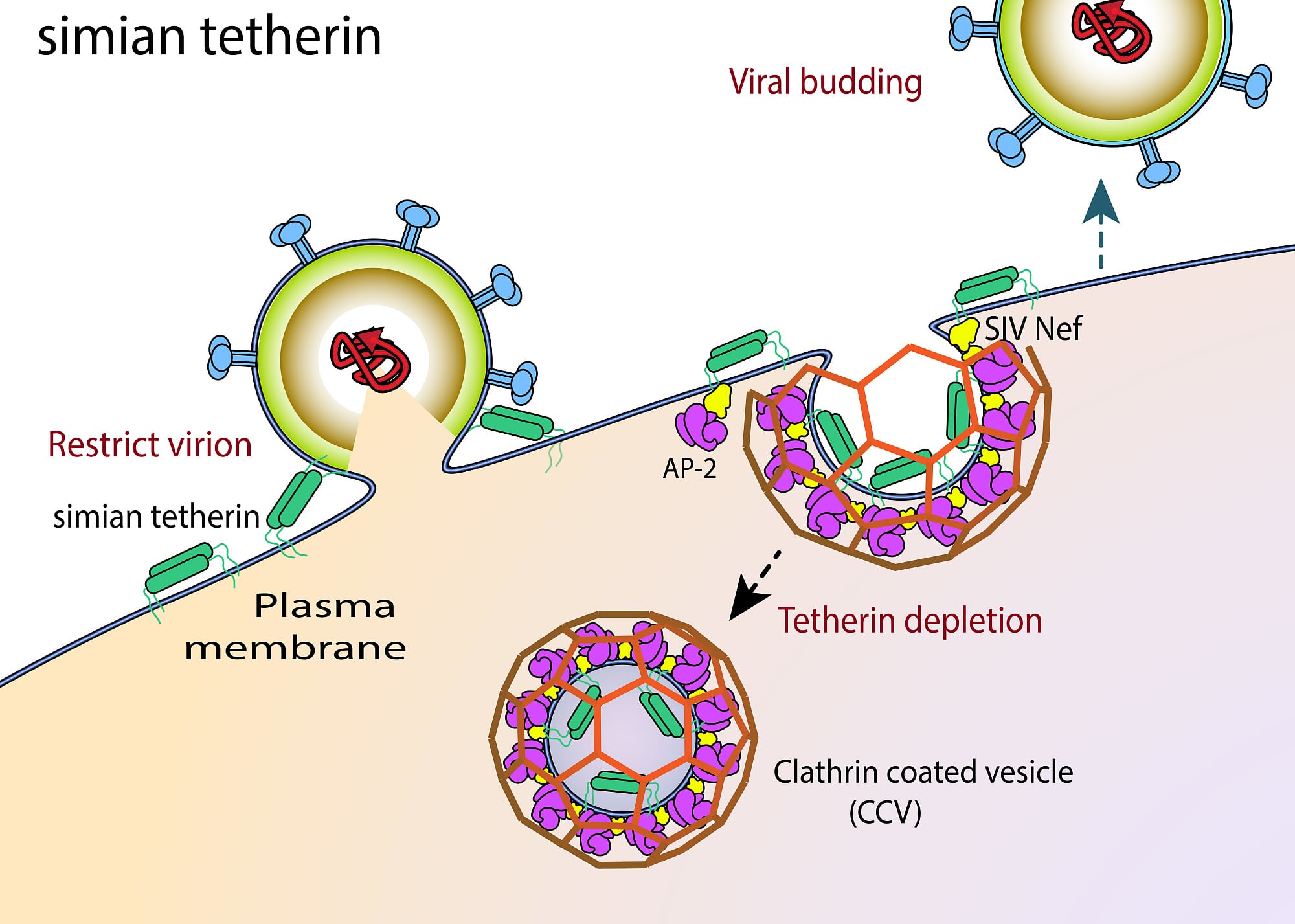 Das Team um James Hurley von der University of California in Berkeley und Frank Kirchhoff von der Universität Ulm beschreibt, dass diese lange erfolgreiche HIV-Sperre auf eine im Lauf der Entwicklung des modernen Menschen aufgetretene Mutation zurückgeht: Sie entfernte bei uns fünf strategisch entscheidende Aminosäuren und veränderte so die Form des Proteins Tetherin. Dieses Protein wird bei Virusattacken vom Immunsystem von Primaten, Affen und Menschen angefordert und auf der Oberfläche von Zellen in Stellung gebracht. Dort soll es als Proteinverbund eigentlich verhindern, dass neu gebildete Viren eine infizierte Zelle wieder verlassen können: Es fesselt virusgefüllte Bläschen so lange an den Zellen, bis das Immunsystem dies erkennt und die Zellen zerstört. Gerade die SI-Viren kennen aber Gegenmaßnahmen: Sie lassen Anti-Tetherin-Proteine wie Nef bauen, die dann die Rekrutierung des Abwehrproteins stoppen, sich mit Tetherinen verbinden und diese von der zelleigenen Müllabfuhr zerstören lassen. Damit ist der Weg aus der Zelle für die Viren frei.