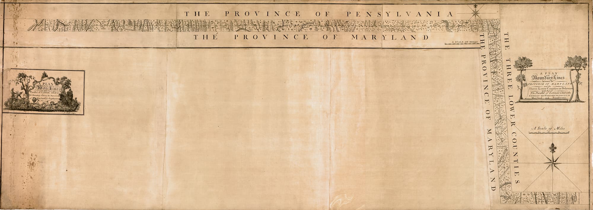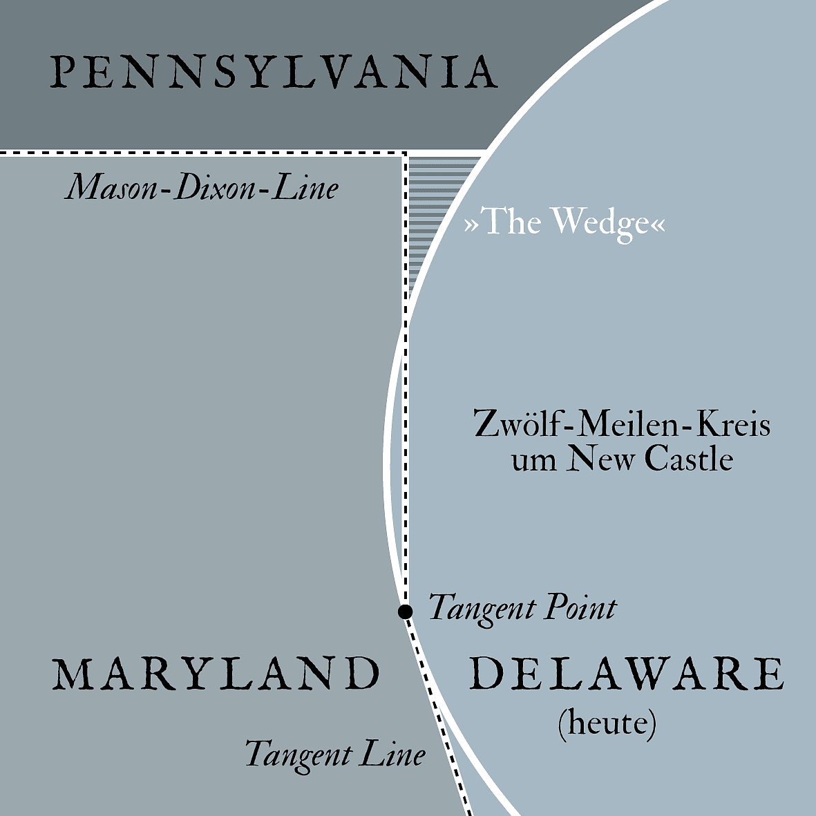 Auch der Verlauf der Trennungslinie im Osten sorgte für Aufruhr. Die englische Krone hatte zwar festgelegt, dass der Delaware die Kolonie Pennsylvania beschneiden sollte, William Penn aber war es gelungen, durch einen Pachtvertrag mit dem Herzog von York und späterem König James II. sein Territorium auf die heute so genannte Delmarva-Halbinsel zu erweitern. Hier fand sich auch die Stadt New Castle samt ihres charakteristischen, kreisrunden Stadtgebiets, das alles Land innerhalb eines Zwölf-Meilen-Radius um den Rathausturm umfasste. Allerdings - wie könnte es anders sein - beanspruchte Maryland dieses Gebiet nahezu vollständig für sich, da Lord Baltimore in der Gründungsurkunde den gesamten Raum zwischen den Quellen des Potomac im Westen und dem Atlantik im Osten zugesichert worden war und Pennsylvania sich damit zudem deutlich über den 40. Breitengrad hinaus vergrößern würde, wo auch immer dieser nun liegen mochte.