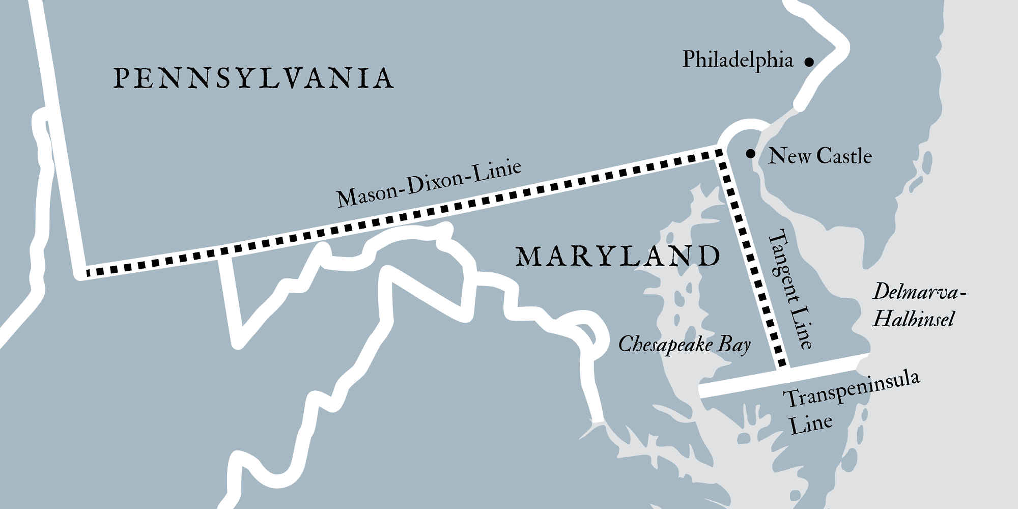 Der Aktionsradius der beiden bleibt infolgedessen zunächst auf den Osten beschränkt. Doch auch hier gibt es reichlich Arbeit. Zum einen hatte man sich ja für den Verlauf der Südgrenze Pennsylvanias auf die Formel »15 Meilen südlich des südlichsten Punkts Philadelphias« geeinigt. Doch wo lag dieser Punkt? Welche Koordinaten hatte er? Zum anderen war noch immer offen, wo jene ominöse Zweiteilung verläuft, die die Delmarva-Halbinsel halbiert und die Ostgrenze Marylands bildet.