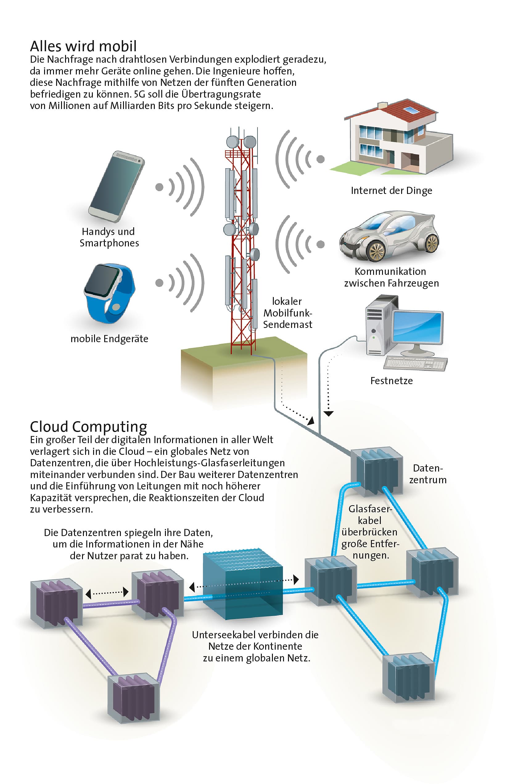 "Wenn ich mein Handy heraushole, denkt jeder, es handle sich um ein drahtloses Telekommunikationsgerät", sagt Neal Bergano, Technischer Direktor von TE SubCom, einem Produzenten für Unterseekabel in New Jersey. Doch das sei nur ein Teil der Wahrheit: "Zwar sind die Nutzer mobil, aber das Netz ist es nicht." Nutzt jemand sein Handy, so wird sein Radiosignal von der nächstgelegenen Basisstation in ein optisches Signal umgewandelt, das dann durch das Glasfasernetz an sein Ziel gelangt.