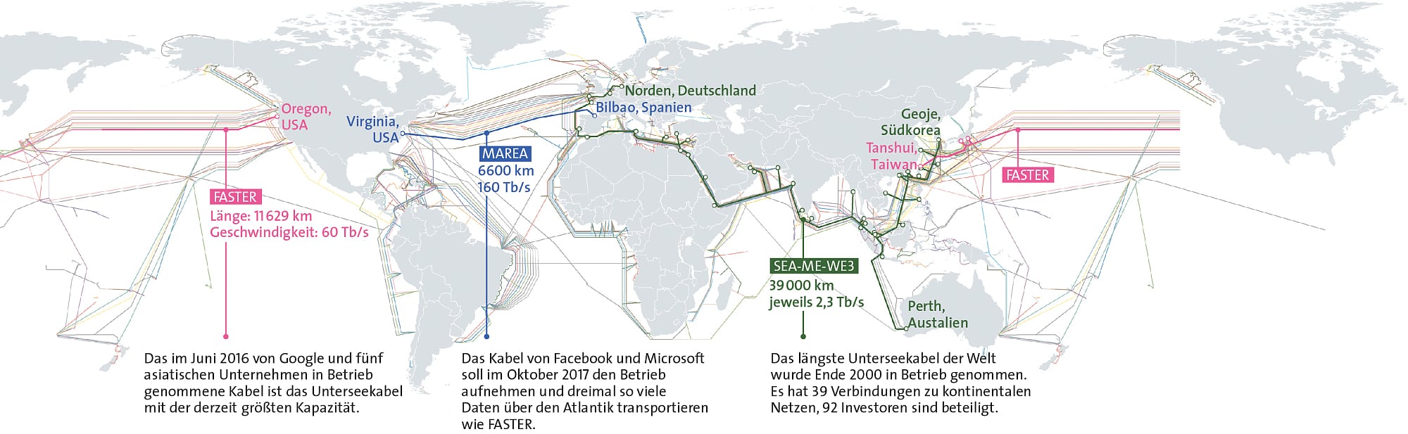 Deshalb geben sie Milliarden aus, um die Verkehrsstaus zu beseitigen und das Internet in aller Eile zu erneuern. Das wird als ebenso wichtig für die digitale Revolution angesehen wie der Ausbau der Rechenleistung. Google hat sich mit fünf asiatischen Telekommunikationsunternehmen zusammengetan, um ein 11 600 Kilometer langes, 300 Millionen US-Dollar teures Glasfaserkabel vom US-Bundesstaat Oregon nach Japan und Taiwan zu verlegen, das im Juni 2016 den Betrieb aufnahm. Microsoft und Facebook verlegen ein weiteres Kabel über den Atlantik, das 2017 in Betrieb gehen soll. "Die Unternehmen tätigen derart großvolumige Investitionen, um ihre Geschäfte zu stützen", sagt Erik Kreifeldt, Experte für Unterseekabel vom Telekommunikations-Marktforschungsunternehmen TeleGeography in Washington: Sie können sich schlicht keine Engpässe im Internet leisten.