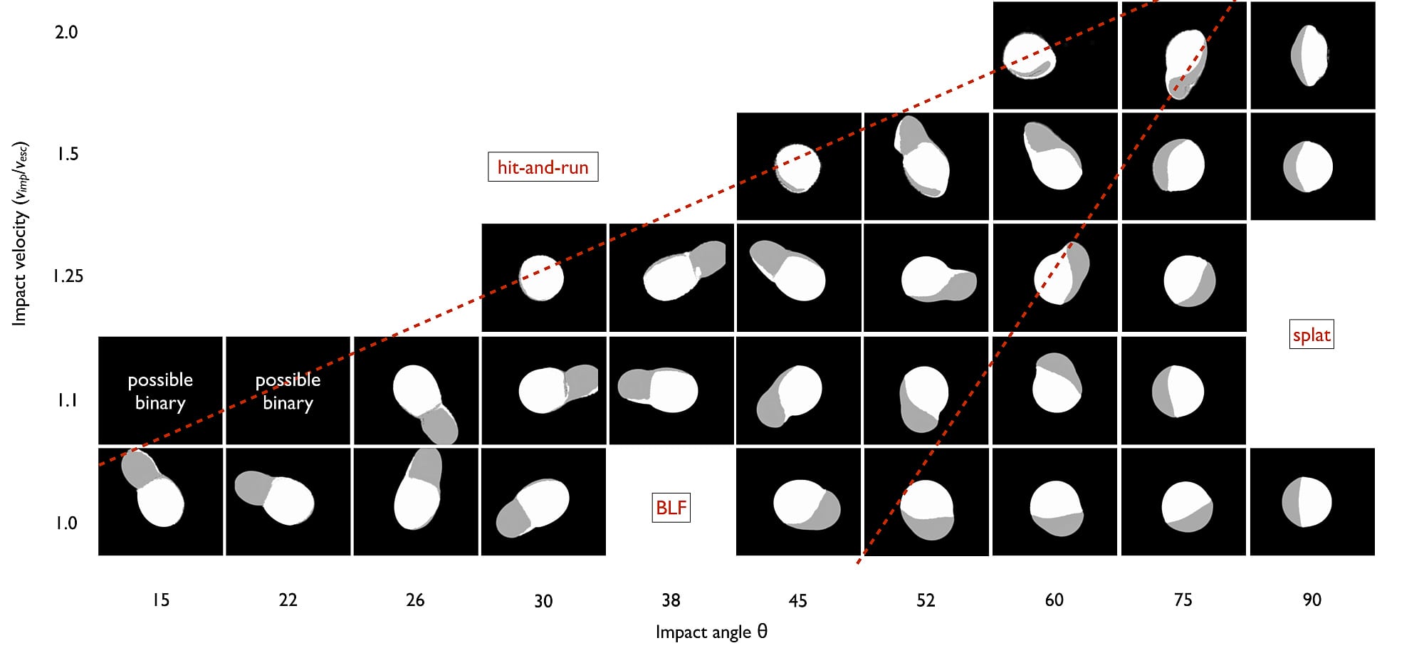 Die beiden Forscher gehen davon aus, das sich Kometenkerne ursprünglich aus 100 bis 1000 Meter großen Himmelskörpern bildeten, die auch "Kometesimale" genannt werden. Sie kollidieren miteinander mit Geschwindigkeiten von wenigen Metern pro Sekunde, was etwa der Kollision zweier Fahrradfahrer entspricht. Wenn diese Objekte geringer innerer Festigkeit aufeinandertreffen, zermalmen sie sich zu verformten, rotierenden Materieansammlungen, bei denen auch einige Bruchstücke entweichen. In einem Beispiel ihrer Simulationen kollidieren zwei etwa ein Kilometer große Himmelskörper ohne innere Festigkeit mit wenigen Metern pro Sekunde in einem Winkel von 52 Grad. Dabei hinterlässt der kleinere Himmelskörper beim streifenden Aufschlag eine Schicht seines Materials auf dem Zielobjekt. Danach trennt er sich wieder vom Zielobjekt, um rund einen Tag später erneut sanft mit ihm zusammenzustoßen. Dabei verkleben die beiden Himmelskörper miteinander und bilden eine schmale Taille zwischen sich aus, die sehr dem Hals des Kometenkerns von 67P ähnelt.