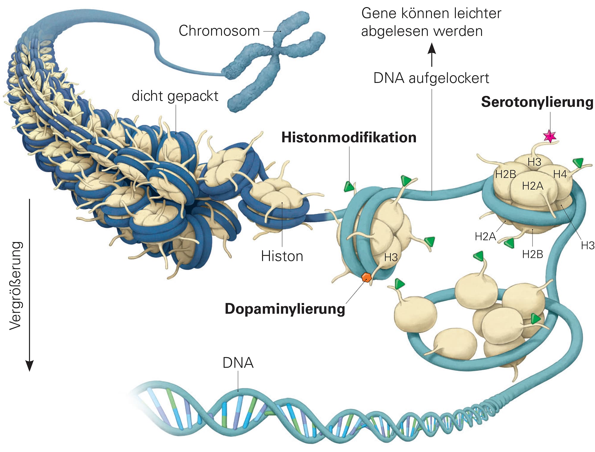 Wie ich durch die Lektüre der »Science«-Studie erfuhr, hatte ein Forschungsteam unter der Leitung von Ian Maze von der Icahn School of Medicine in New York 2019 eine neue Funktion von Serotonin aufgedeckt: Das Signalmolekül kann als epigenetische Post-it-Notiz wirken, indem es sich an das Histon H3 bindet. So aktiviert es Gene, die menschliche Stammzellen in Serotonin ausschüttende Neurone umwandeln. Stammzellen, deren Zellkerne nie in Kontakt mit dem Botenstoff kommen, bilden dagegen andere Zelltypen aus.