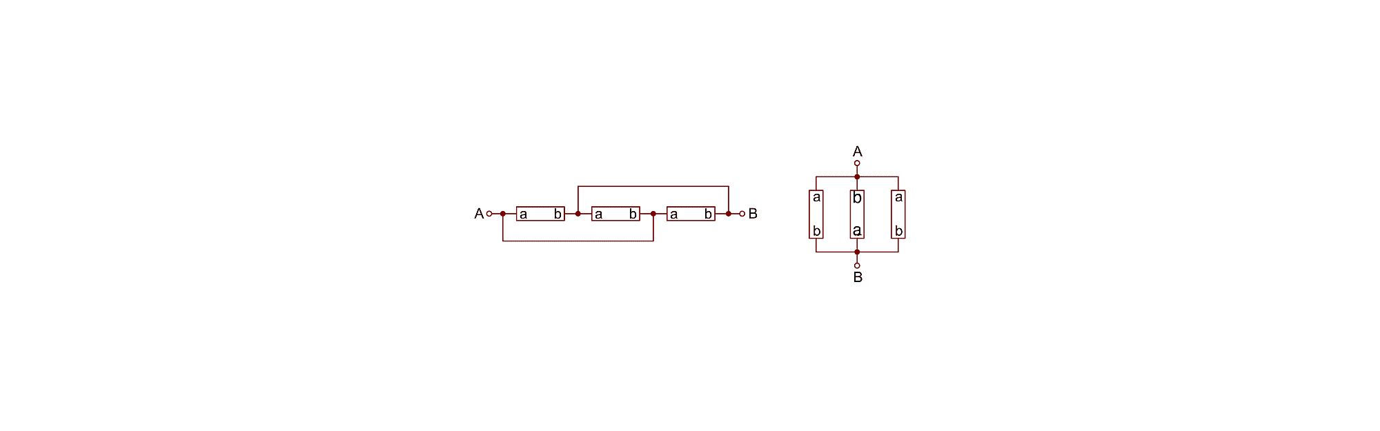 Bis auf den mittleren sind die Widerstände mit ihrem a-Ende direkt mit dem Punkt A und mit ihrem b-Ende direkt mit B verbunden – beim mittleren Widerstand ist es anders herum. Es handelt sich also um eine einfache Parallelschaltung von drei Widerständen. In einer Parallelschaltung erhält man den Gesamtwiderstand mit der Gleichung 1/Rges = 1/R1 + 1/R2 + 1/R3 + …