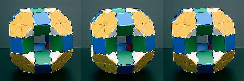 Lässt man genau zwei Teile weg, beispielsweise zwei einander gegenüberliegende, so gibt es Polyeder mit Torus-Topologie, also mit einem durchgehenden Tunnel und der Euler-Charakteristik 0.