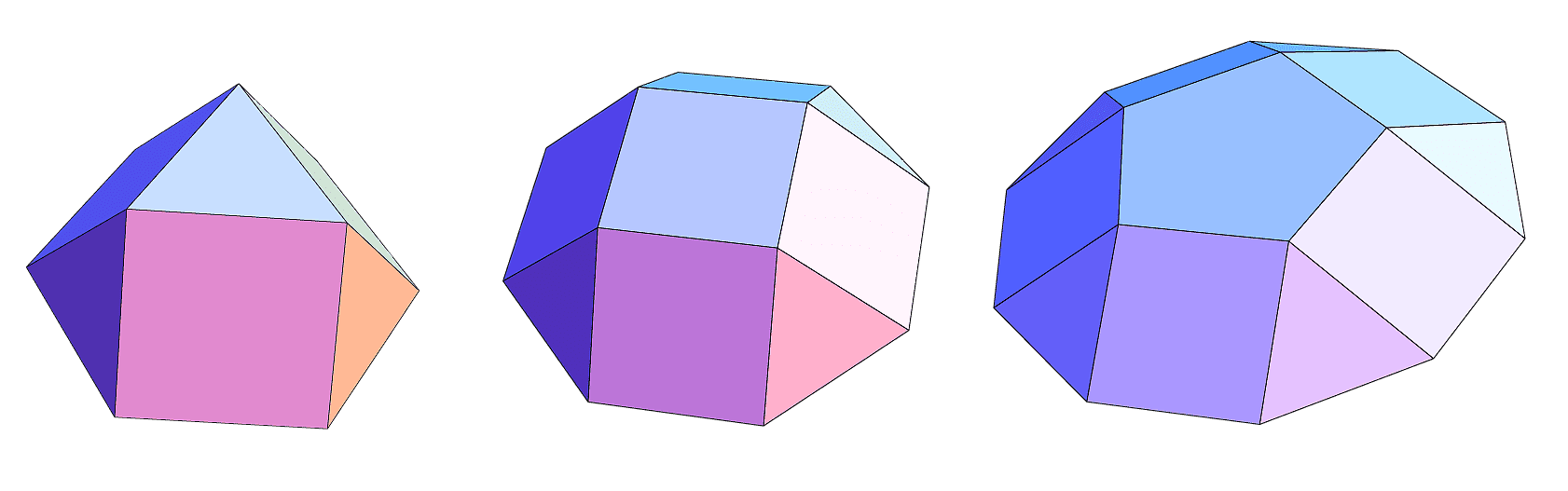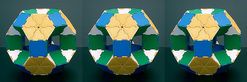 Man kann sogar, ohne Entartungen wie einsam stehende Wände zu erzeugen, alle Teile jeweils einer Art weglassen. Lässt man alle Würfel weg, bekommt man einen Korb mit 12 Öffnungen zu einem Hohlraum (der aber natürlich zum Außenraum des Polyeders gehört). Lässt man die 3-zähligen Kuppeln weg, sind es acht Öffnungen, und bei den 4-zähligen sind es sechs. Diesen Fall zeigen die folgenden Bilder (aus zwei Richtungen):