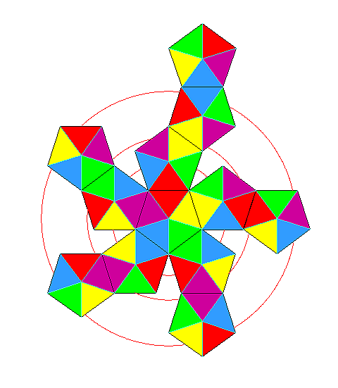 Wenn das Puzzle einmal gelöst ist, kann man natürlich bequem ein Dodekaeder bunt bekleben oder anmalen. Oder Sie drucken diese PDF-Datei farbig auf steifes Papier aus und basteln daraus ein Dodekaeder, das die erste der drei angegebenen Lösungen realisiert.