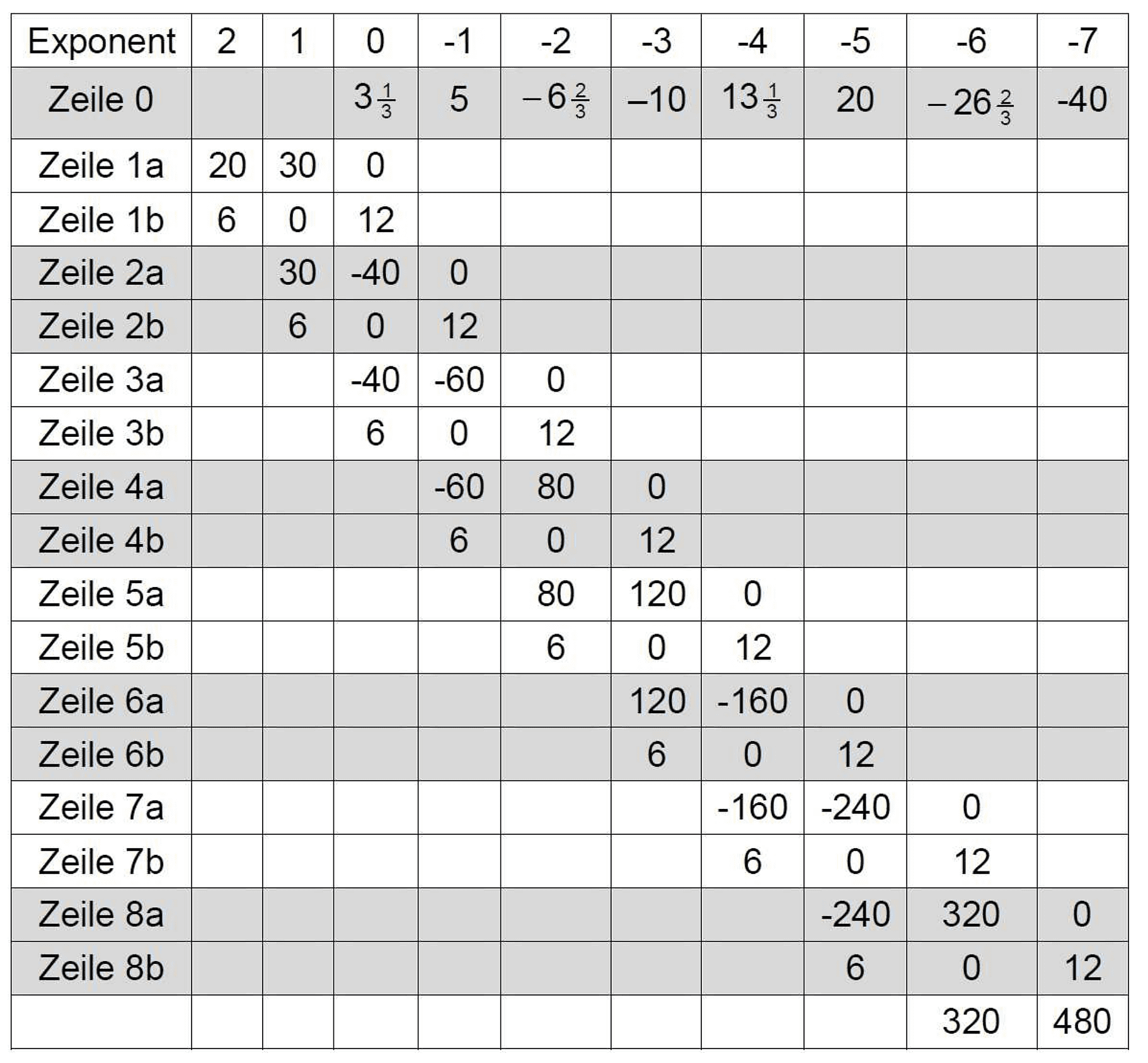 Das Ergebnis \(3\frac{1}{3}\) der Division der höchsten Potenzen, also von \(20x^2: 6x^2\), wird in Zeile 0 eingetragen, dann das \(3\frac{1}{3}\)-fache der Zeile 1b von Zeile 1a subtrahiert und in Zeile 2a notiert. Dieser Vorgang wird nun mit dem um eine Ordnung verschobenen Divisor nach der Art der indischen Arithmetik wiederholt, das Ergebnis \(5\) der Division von \(30x : 6x\) in das nächste Feld von Zeile 0 eingetragen und so weiter.
