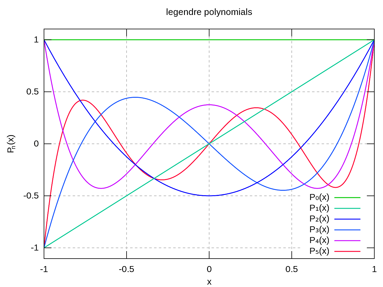 \(\int_{-1}^1 P_n (x)\cdot P_m (x)\ dx = 0\) für \(m \neq n\), sodass man die Polynome bezüglich eines so definierten Skalarprodukts als zueinander orthogonal bezeichnet.