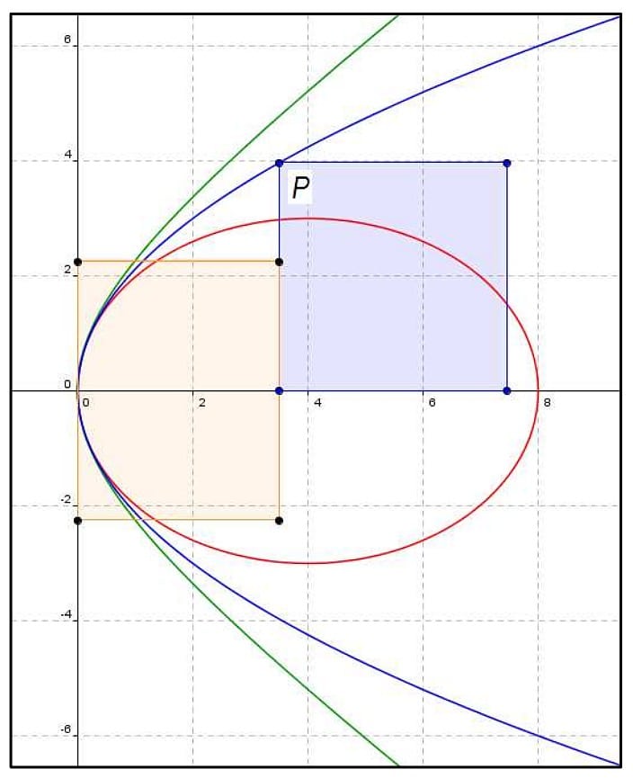 Dazu betrachtet man die Gleichungen in der Form \(y^2 = 2px\) (Parabel), \(y^2 = 2px \pm \frac{p}{a}x^2 \) (Hyperbel beziehungsweise Ellipse). Wählt man auf dem oberen Ast der Parabel einen Punkt \(P (x | y)\) als Eckpunkt eines Quadrats mit der Seitenlänge \(y,\) dann ist dieses Quadrat (blau) flächengleich zu einem Rechteck (orange) mit den Seitenlängen \(x\) und \(2p.\) Dabei ist diese Seitenlänge \(2p\) gerade die Länge der Sehne durch den Brennpunkt des Kegelschnitts; sie wird auch als latus rectum (Quermaß) bezeichnet, \(a\) als latus transversum .