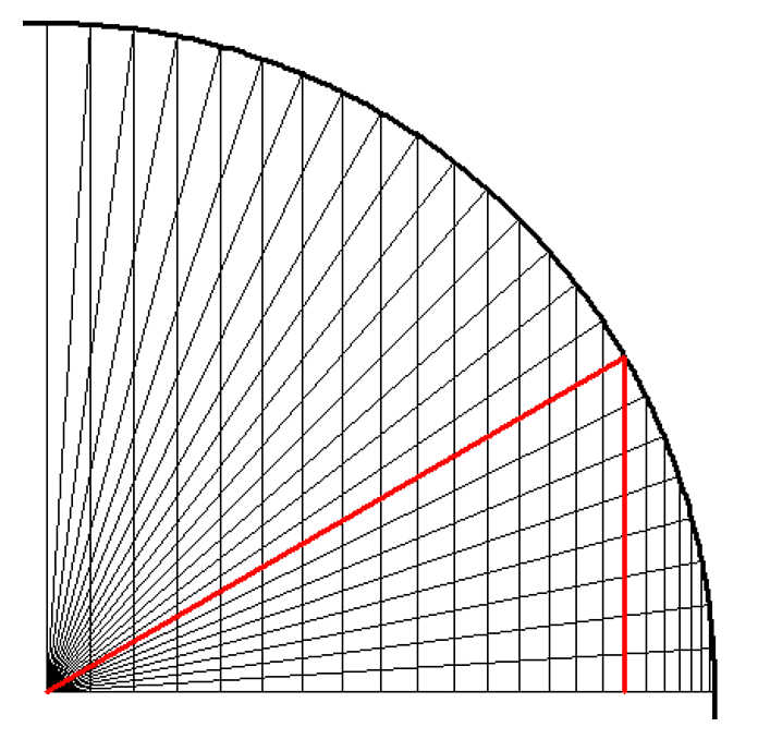 An späterer Stelle erklärt Āryabhata dazu: Unterteilt man einen Viertelkreis mit Radius 3438 in 24 gleich große Sektoren, dann haben die den Winkeln von 3° 45', 7° 30', 11° 15', 15°, ..., 90° gegenüberliegenden Höhen die Längen 225, 225 + 224 = 449, 449 + 222 = 671, 671 + 219 = 890, ..., 3438. Der ungewöhnlich erscheinende Wert für den Radius erklärt sich so: Ein Vollwinkel umfasst 360° = 360 \(\cdot\) 60' = 21600'; der Umfang eines Kreises mit Radius 3438 Längeneinheiten beträgt ziemlich genau 21600 Längeneinheiten, sodass jeder Bogenminute ein Bogen der Länge 1 Längeneinheit zugeordnet werden kann.