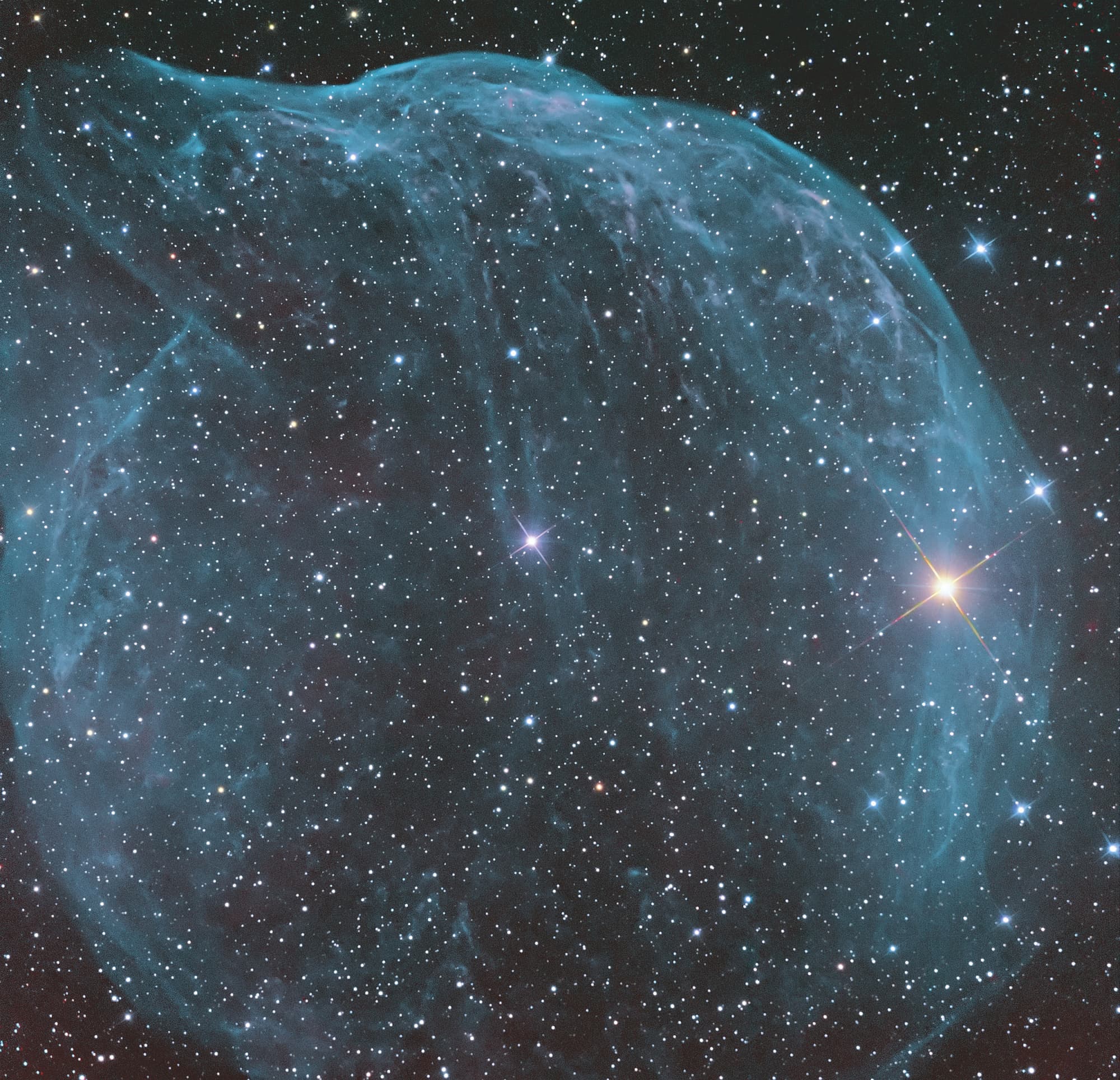 Ihre Sternwinde strömen nicht ungestört nach außen: Sie bilden turbulente Verdichtungen, die sich als Klumpen beobachten lassen und wesentlich zu den Dichteschwankungen des interstellaren Mediums beitragen. Und genau diese Dichteschwankungen und Turbulenzen veranschaulicht das Bild des Crescentnebels.
