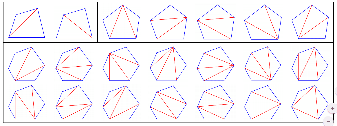 Für ein \(n\)-Eck gibt es \(C_{n-2}\) verschiedene Möglichkeiten der Zerlegung durch Diagonalen; für 4-, 5- und 6-Ecke sind dies also 2 beziehungsweise 5 beziehungsweise 14 Möglichkeiten: