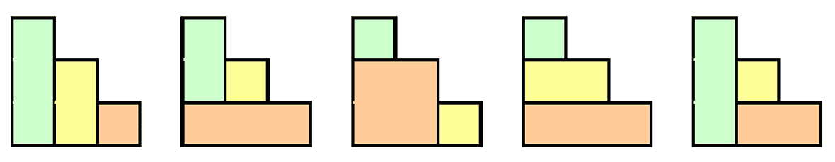 Heute kennt man 66 verschiedene Fragestellungen, in denen die Catalan-Zahlen eine Rolle spielen, zum Beispiel Anzahl der Möglichkeiten. der Zerlegung einer \(n\)-stufigen Treppenfigur in \(n\) Rechtecke, hier dargestellt für \(n = 3\).