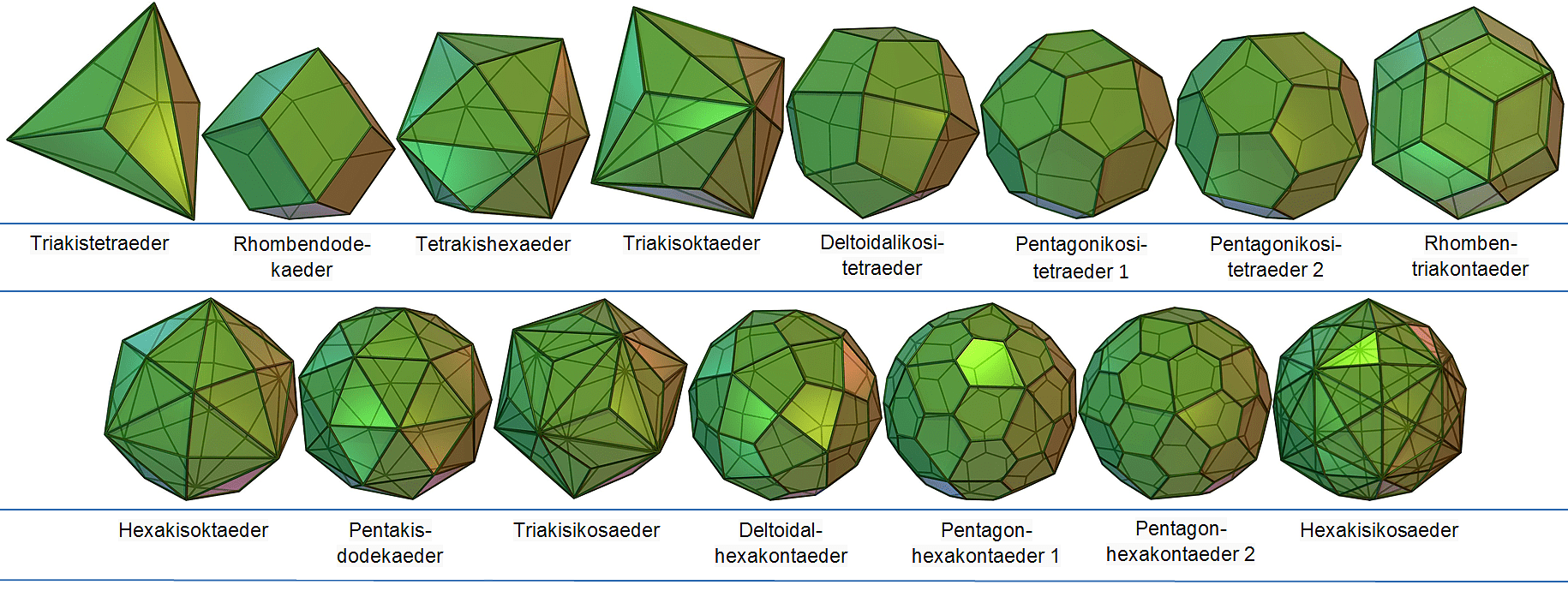 Die nicht-regulären Seitenflächen dieser Catalan'schen Körper sind zueinander kongruent; an den Ecken stoßen jedoch unterschiedlich viele Seitenflächen aneinander. Bei den hierzu dualen archimedischen Körpern ist es umgekehrt: Die Anzahl der an einer Ecke zusammenkommenden Flächen ist stets gleich, jedoch sind die Flächen verschiedenartige reguläre Polygone.