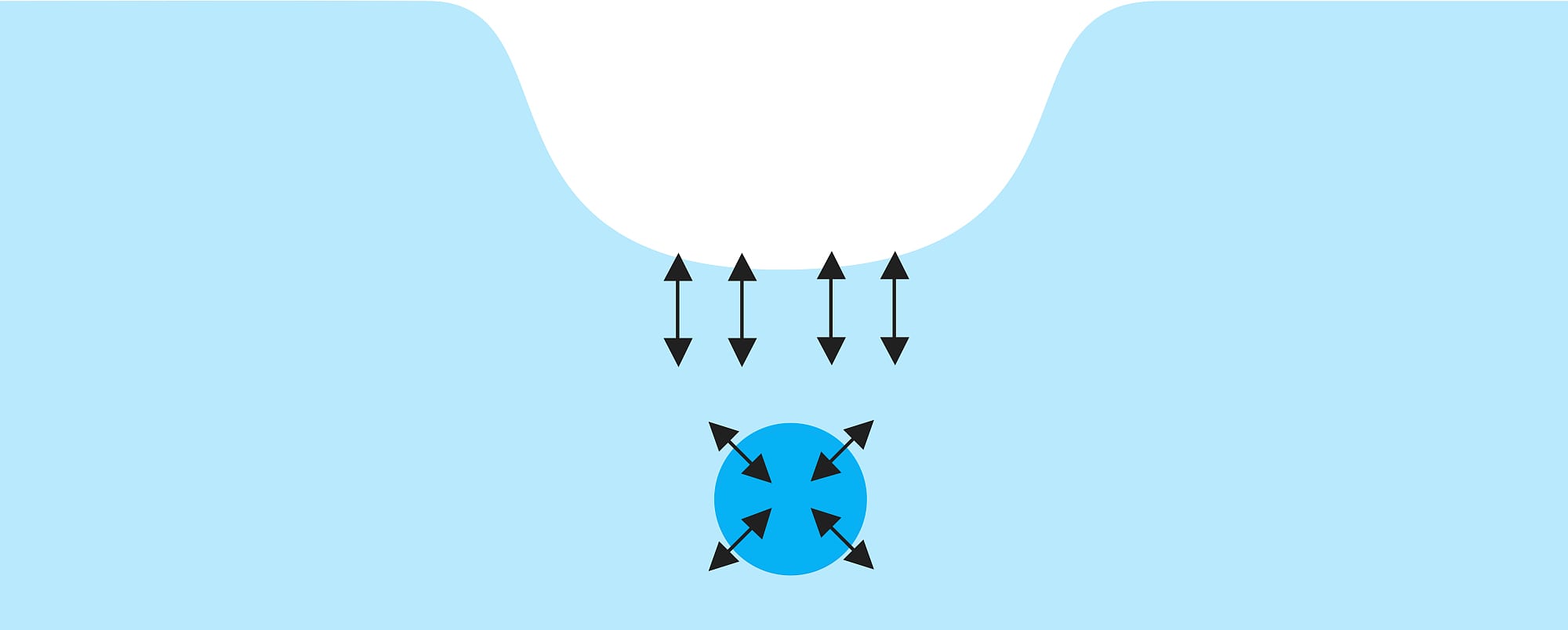 Der auftreffende Tropfen durchdringt die Wasseroberfläche nicht unmittelbar. Vielmehr dellt er sie wegen der relativ großen Grenzflächenspannung zwischen Wasser und Luft zunächst wie eine elastische Membran ein. Erst nachdem sie ringsherum wieder zurückschnellt, durchbricht der Tropfen die Oberfläche. Dabei treibt er einen kleinen Hohlraum in diese hinein, dessen Öffnung sich schließt, bevor die Luft wieder hinausgelangen kann.
