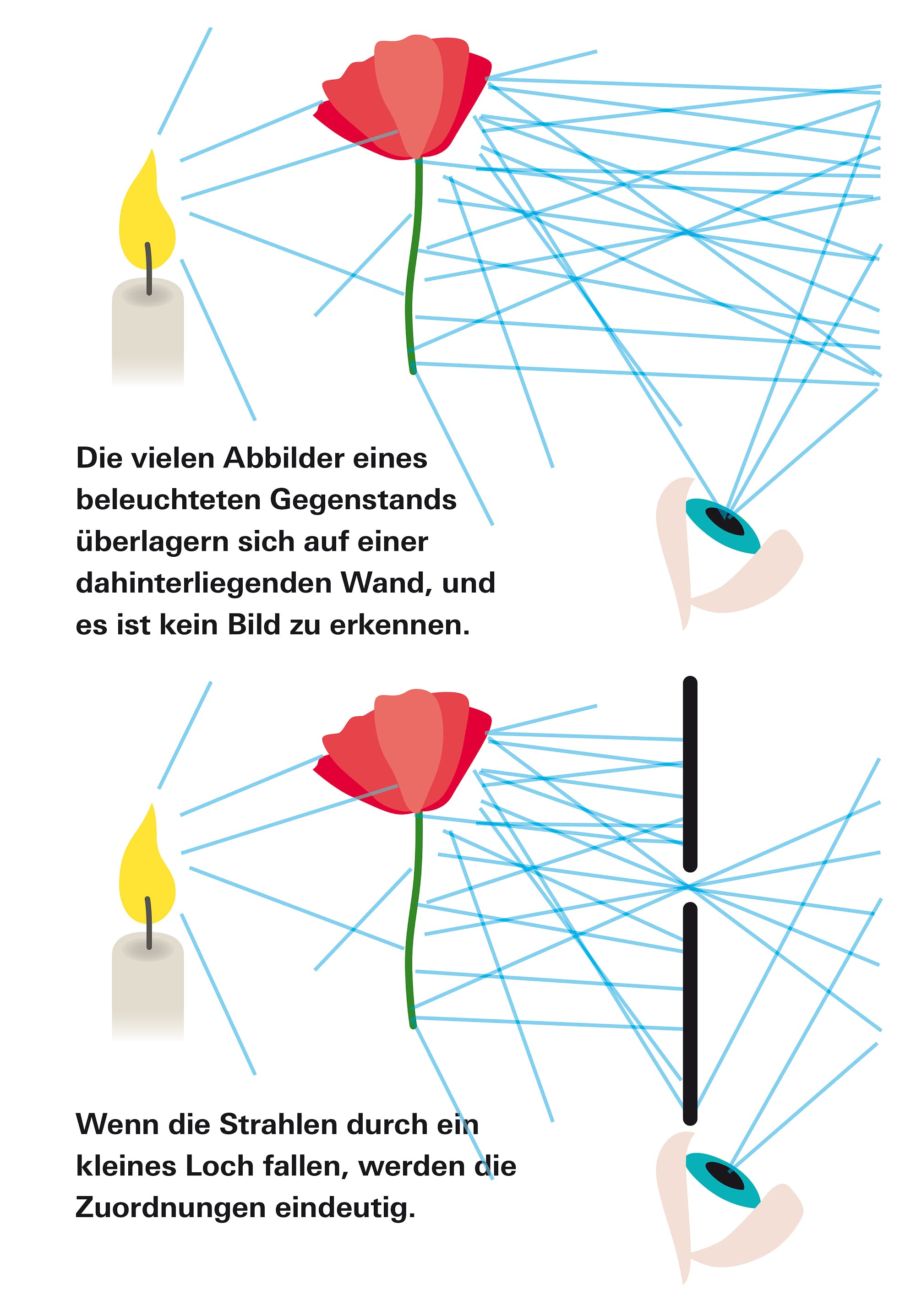 Diese konsequente Weiterentwicklung des euklidischen Strahlenmodells des Lichts erklärt zum Beispiel, warum an einer weißen Wand kein Abbild eines davorstehenden farbigen Gegenstands zu sehen ist. Denn das Licht eines jeden Punkts des Gegenstands gelangt zu jedem Punkt der Wand. Daraufhin überlagern und mischen sich die Farben und die Helligkeiten. Nur wenn die Lichtstrahlen durch ein sehr kleines Loch fallen, ist die Zuordnung zwischen den Punkten des Gegenstands und der Wand eindeutig. Leonardo erkennt das und bewundert, wie »schon verlorene, in einem so kleinen Raum verschmolzene Formen bei seiner Erweiterung wieder hervorgebracht und neu gebildet werden können«. Mit »Erweiterung« meint der Künstler ein Loch in der Wand, durch welches das Licht in einen benachbarten Raum fällt. Er fragt sich zudem, warum »aus verschwommenen Ursachen so deutliche und klare Wirkungen hervorgehen«, und bemerkt, dass die Bilder dann immer auf dem Kopf stehen: »Es ist unmöglich, dass die Bilder, die durch Löcher in einen dunklen Raum dringen, nicht umgekehrt erscheinen.« Leonardo hat das Prinzip der Camera obscura als wesentliches Element der optischen Abbildung ausgemacht und in ausgeklügelten Modellexperimenten auf das menschliche Auge angewandt. So gelangte er zu einer im Wesentlichen korrekten Erklärung des Sehens.