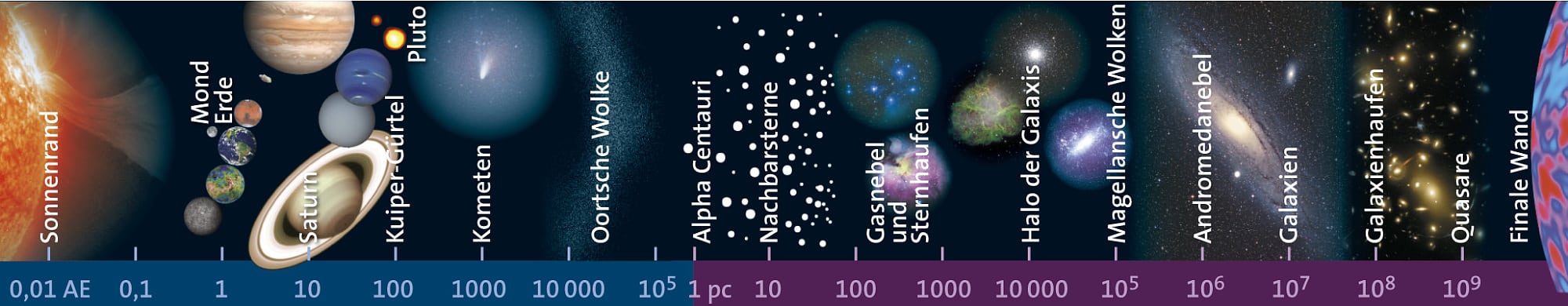 Die Entfernungen im Universum sind nach menschlichen Maßstäben riesig und erstrecken sich über viele Größenordnungen. Deshalb nutzen Astronomen verschiedene Längenmaße: Abstände im Sonnensystem werden in den Einheiten Kilometer (km) oder Astronomische Einheit (AE) angegeben, Distanzen zwischen den Sternen oder Galaxien in den Einheiten Lichtjahr (Lj) oder Parsec (pc).