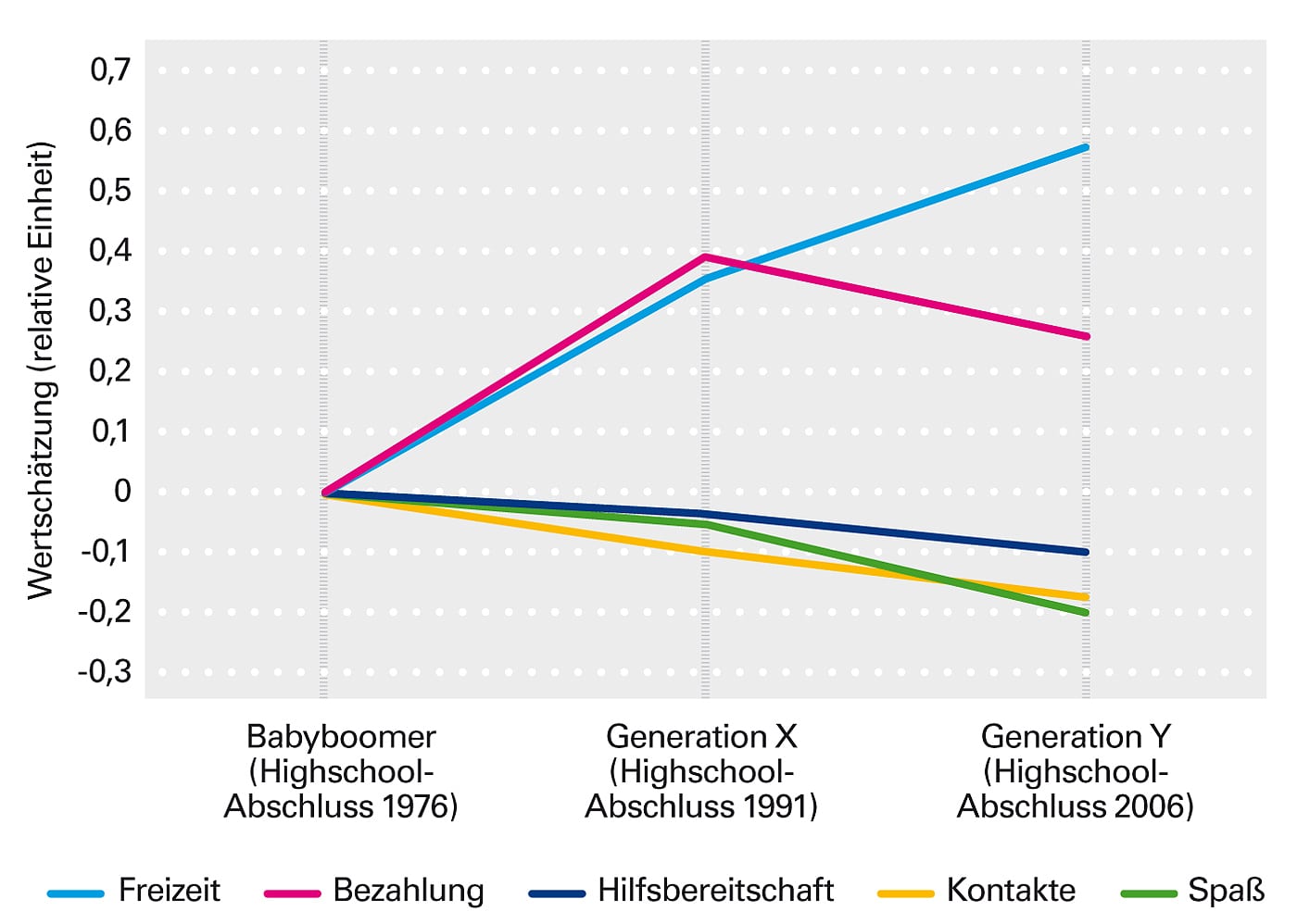 Zudem haben sich über die Generationen hinweg auch die Werte verschoben, wie das Team um die amerikanische Psychologin Jean Twenge 2010 herausfand. Die Arbeitsgruppe von der San Diego State University beschäftigte sich mit der Frage, wie sich die arbeitsbezogenen Werte über die vergangenen drei Generationen – die "Babyboomer" (Geburtsjahrgänge zwischen den 1940er und 1960er Jahren), die "Generation X" (1960er bis frühe 1980er Jahre) und die "Generation Y" (geboren bis 1998) – verändert haben. Dabei zeigte sich, dass die Generationen X und Y stärker extrinsisch motiviert sind als die Babyboomer. So orientieren sich die Nachgeborenen bei der Arbeitsplatzwahl eher an Bezahlung, Ansehen und vermeintlicher Sicherheit. Die intrinsische Motivation, etwa durch Spaß an der eigenen Tätigkeit, hat dagegen mehr und mehr abgenommen (siehe Grafik "Werteverschiebung in der Arbeitswelt").
