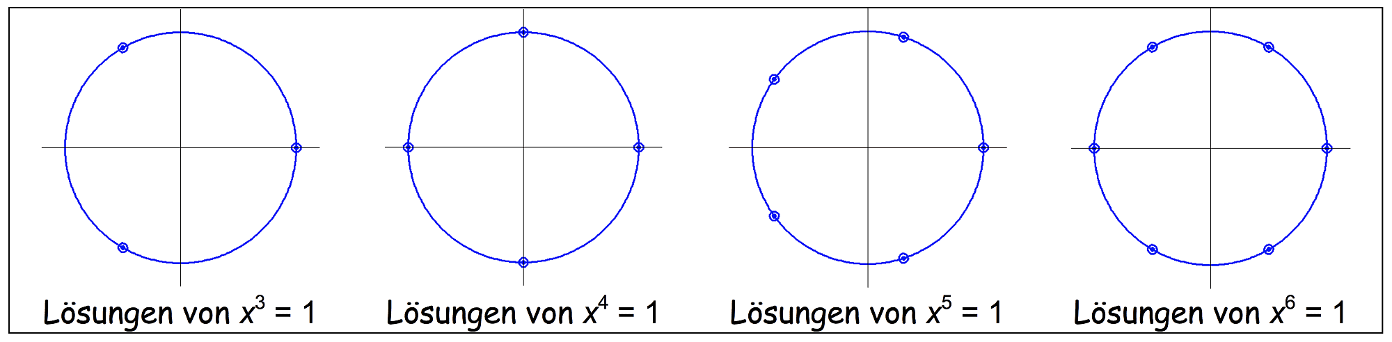 Kummer war 1844 auf dieses Phänomen bei der Untersuchung von Lösungen der Kreisteilungsgleichungen gestoßen, das sind Gleichungen der Form \(x^n =1\). Nach dem von Gauß bewiesenen Fundamentalsatz der Algebra besitzt jede Gleichung \(n\)–ten Grades in der Menge \(\mathbb{C}\) der komplexen Zahlen genau \(n\) Lösungen. In der Gauß'schen Zahlenebene sind die Lösungen von \(x^n =1\) Punkte des Einheitskreises und Eckpunkte von regelmäßigen \(n\)-Ecken mit den Koordinaten \( \left( \cos\left(\frac{2\pi k}{n}\right), \sin\left(\frac{2\pi k}{n}\right) \right) \) mit \( 0 \leq k < n\), \( k \in \mathbb{N}\).