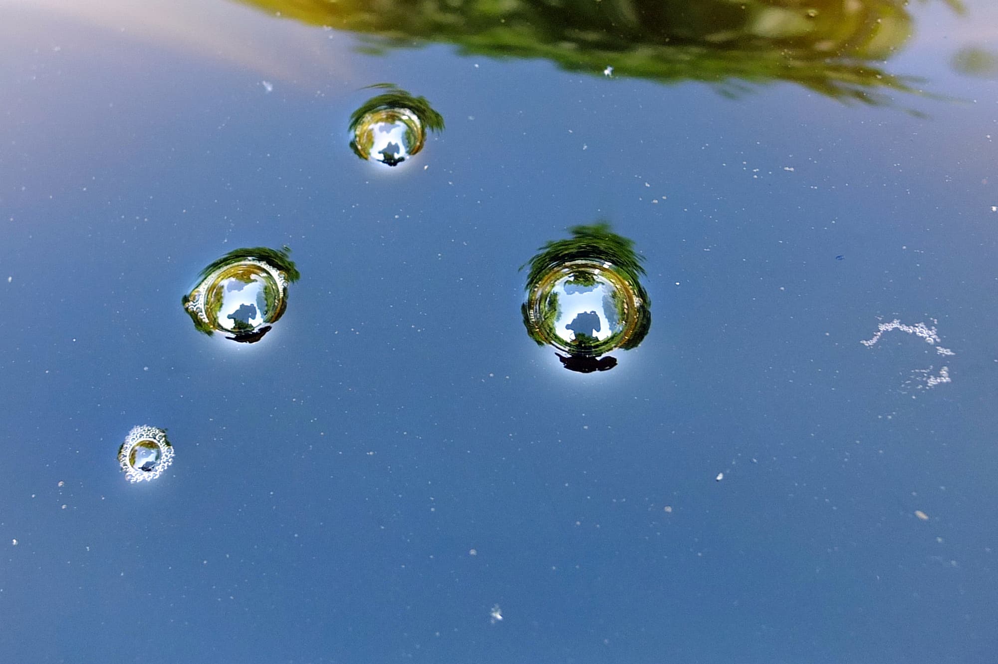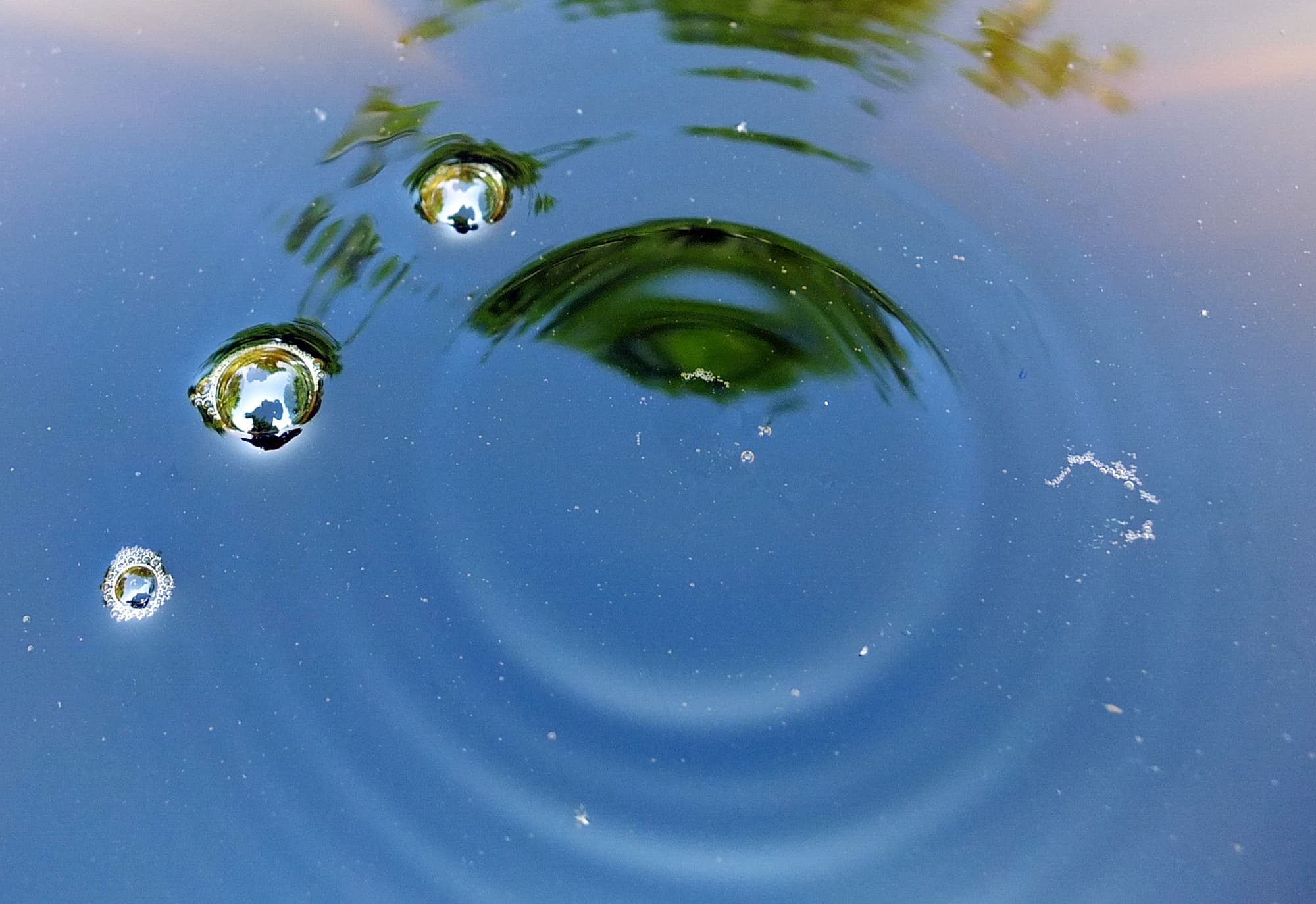 Wenn ein Springbrunnen in einem Teich plätschert, entstehen auf der Wasseroberfläche größere und kleinere Luftblasen, die davontreiben und in ruhigerer Umgebung ein manchmal überraschend langes Dasein fristen. Eigentlich ist es bereits erstaunlich, dass sie sich überhaupt bilden – hat man es denn nicht bloß mit Wasser in seinen unterschiedlichen Formen und Bewegungszuständen zu tun? Aber wenn ein Tropfen des Brunnens aus einiger Höhe ins Wasser fällt, drückt er es beim Eintauchen zu den Seiten weg und reißt regelrecht ein Loch hinein. Die Oberfläche schließt sich mit einer kurzen Verzögerung wieder über dem sinkenden Tropfen, und ein Hohlraum bleibt zurück (siehe »Der Klang des tropfenden Wassers«, Spektrum Februar 2019, S. 60). Die eingefangene Luft bewegt sich wegen ihrer geringen Dichte sofort aufwärts und drückt eine dünne Wasserhaut mit nach oben. Oft platzt die Blase gleich, doch gelegentlich lässt sie sich damit noch einige Zeit.