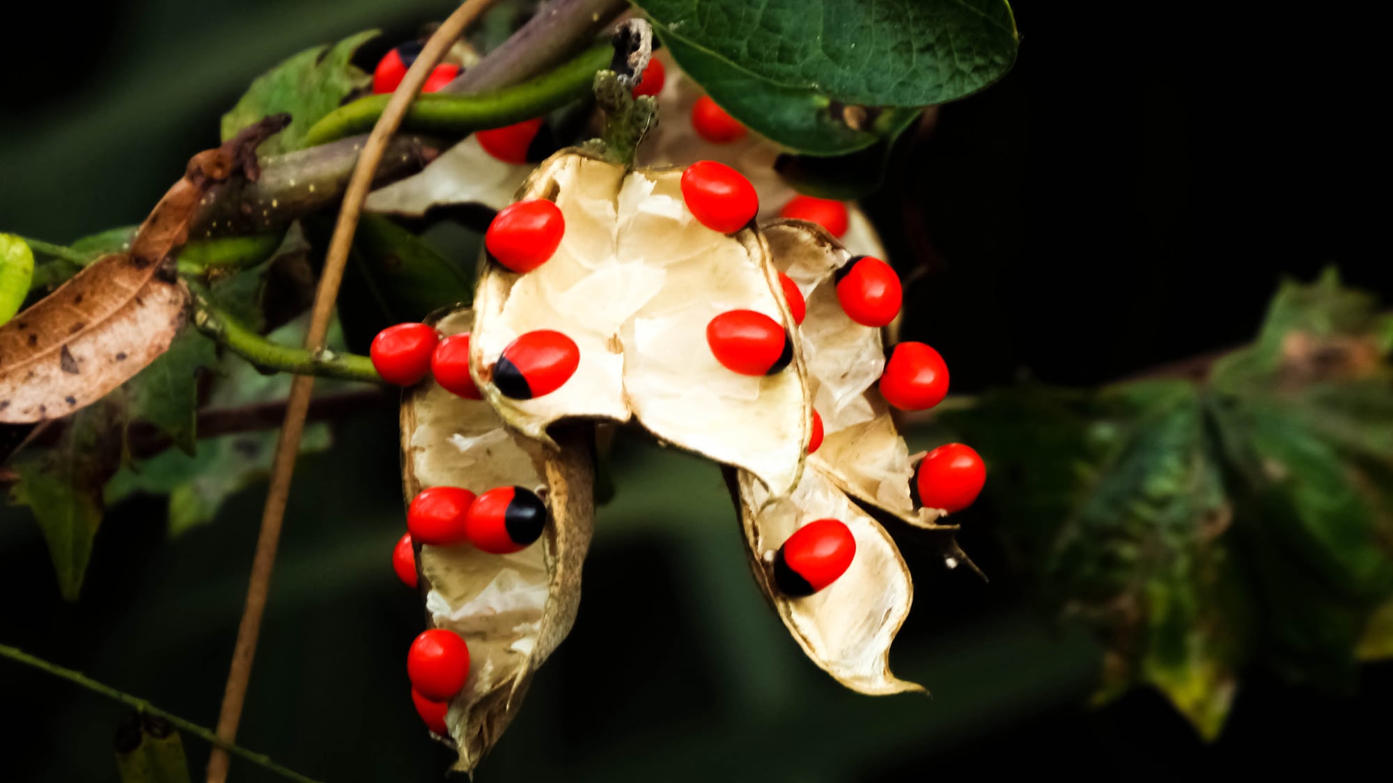Die leuchtend rot-schwarzen Samen des Paternosterbaums (Abrus precatorius) werden gerne zu schmückenden Hals- oder Gebetsketten verarbeitet. Doch darauf herumkauen sollte man nicht: Bereits eine Erbse der zu den Hülsenfrüchten zählenden Pflanze kann wegen des darin enthaltenen Toxins Abrin tödlich wirken. Es zählt zu den potentesten Giften der Pflanzenwelt und wirkt ähnlich wie das Rizin des Wunderbaums. Schon 0,01 Mikrogramm pro Kilogramm Körpergewicht reichen aus, um einen Erwachsenen zu töten. Mit einem Gramm Abrin könnte man 1,5 Millionen Menschen umbringen. Es handelt sich um ein sehr starkes Stoffwechselgift, das die Proteinbiosynthese in den Zellen zerstört – und damit einen grundlegenden Prozess im Körper. Werden reife und intakte Erbsen verschluckt, stellt dies allerdings erst einmal keine Gefahr dar, denn sie passieren den Magen-Darm-Trakt wegen ihrer sehr harten Schale unverdaut. Für die Ketten werden die Samen jedoch durchbohrt, was die Vergiftungsgefahr erhöht.