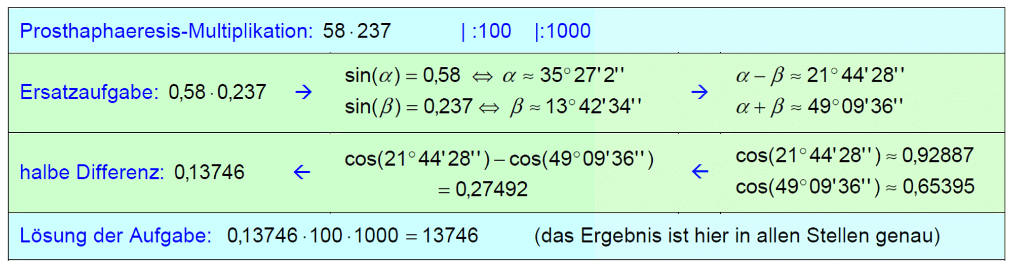 Um eine Multiplikationsaufgabe zu lösen, dividiert man zunächst die beiden Faktoren durch geeignete Zehnerpotenzen, bestimmt dann mit Hilfe einer Sinus-Tabelle jeweils den zugehörigen Winkel und schlägt den Kosinus des Differenz- beziehungsweise Summenwinkels nach; schließlich wird die halbe Differenz der Kosinuswerte mit den oben gewählten Zehnerpotenzen multipliziert. Die Genauigkeit des Ergebnisses hängt offensichtlich von der Qualität und von der Stellenzahl der trigonometrischen Tabellen ab.