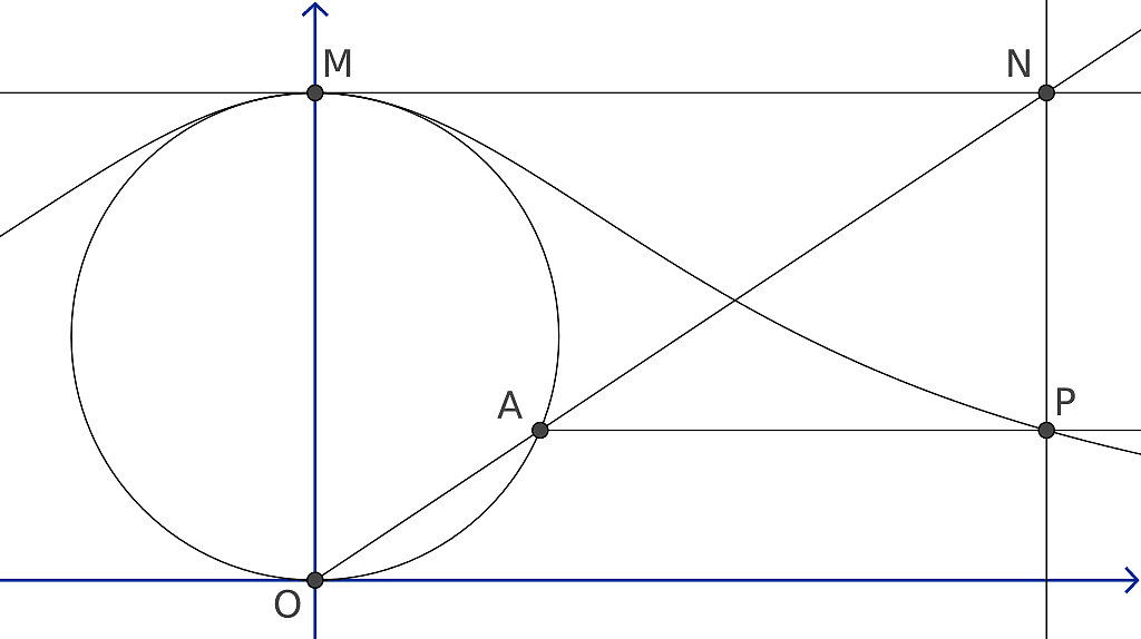 Ausgehend von einem Kreis mit festem Radius \(r\), auf dessen Durchmesser die Punkte \(O(0;0)\) und \(M(0;2r)\) liegen, zeichnet man von \(O\) aus durch einen beliebigen Punkt \(A\) der Kreislinie eine Gerade. Diese schneidet die Gerade mit \(y = 2r\) in einem Punkt \(N(n;2r)\), eine Parallele hierzu durch \(A\) schneidet die Gerade mit \(x = n\) im Punkt \(P\). Bewegt man \(A\) auf der Kreislinie, dann ist die Ortskurve von \(P\) die gesuchte Kurve. Sie erfüllt die Funktionsgleichung \( y=\frac{8r^3}{x^2+4r^2},\) also \( \frac{y}{2r} = \frac{1}{\left(\frac{x}{2r}\right)^2 +1}\).