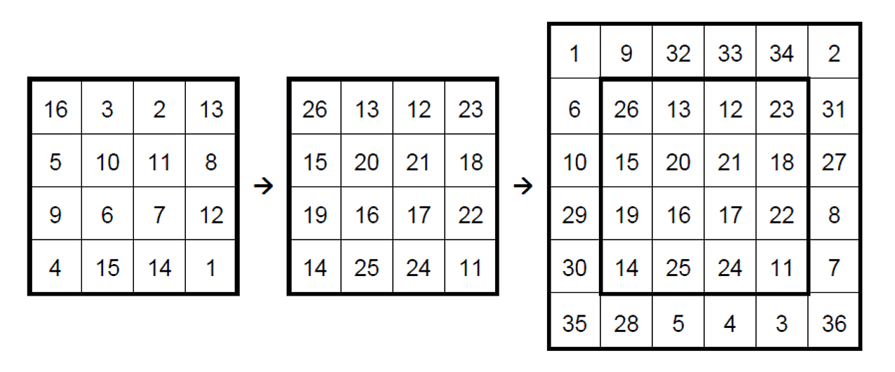 Ebenfalls in der »Arithmetica integra« enthalten ist die »Rahmenmethode« zur Erzeugung eines magischen Quadrats der Ordnung \(n+2\) aus einem der Ordnung \(n\): Man erhöht jede Zahl um \(2n+2\) und gewinnt so das Innere des umgebenden magischen Quadrats (die Zahlen außen müssen noch ergänzt werden).