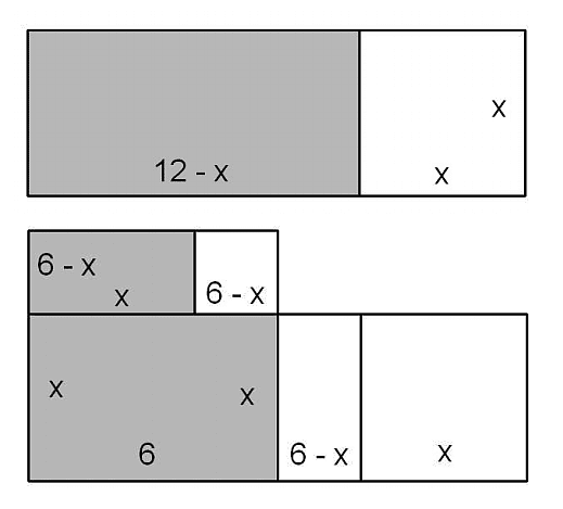 Wir betrachten ein Rechteck mit den Seitenlängen \(12\) und \(x\), also mit Flächeninhalt \(12x\); rechts trennen wir ein Quadrat mit Flächeninhalt \(x^2\) ab; das restliche Rechteck (grau unterlegt) hat den Flächeninhalt \(35\). Wir halbieren dann die Grundseite des ursprünglichen Rechtecks und ergänzen die linke Hälfte des Rechtecks zu einem Quadrat (Seitenlänge \(6\), also mit Flächeninhalt \(36\)).