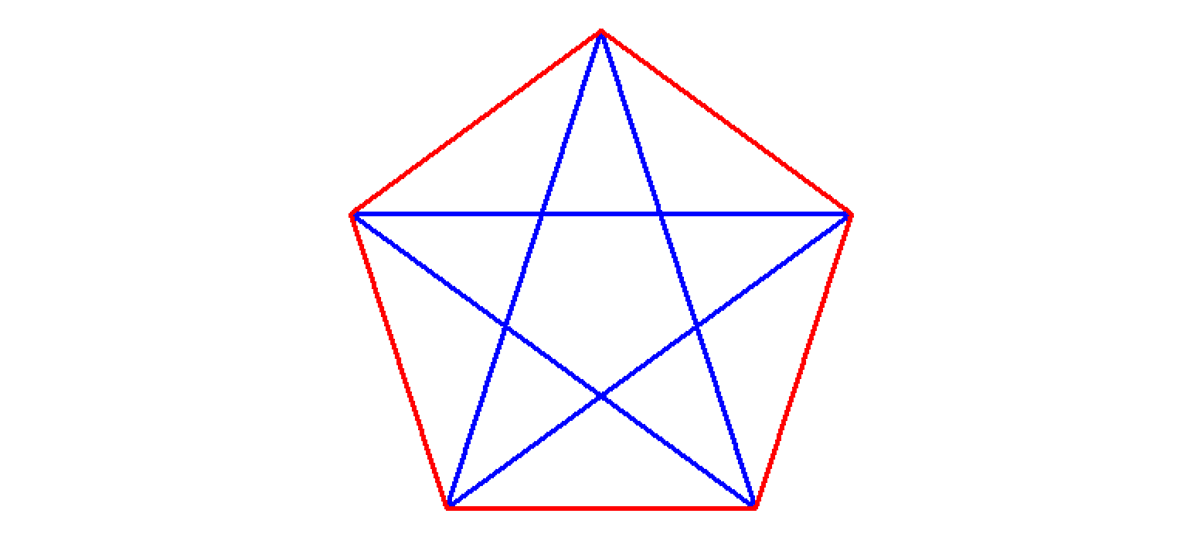 Beispielsweise ist \(R(3,3) = 6\); denn bei einem vollständigen Graphen mit nur 5 Punkten kann man die Färbung der Kanten so vornehmen, dass es weder einen vollständigen Teilgraphen in der einen Farbe mit 3 Punkten gibt, noch in der anderen Farbe.
