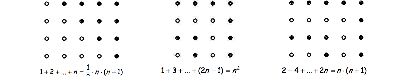 Zum Rechnen verwenden die Pythagoreer schwarze und weiße Steinchen, die zu geometrischen Figuren gelegt werden; so lassen sich Summenformeln ablesen, zum Beispiel für die Summe aufeinander folgender natürlicher Zahlen oder aufeinander folgender ungerader beziehungsweise gerader Zahlen – in den letzten beiden Mustern werden die Steinchen in Form von so genannten Gnonomen (Winkelhaken) gelegt: