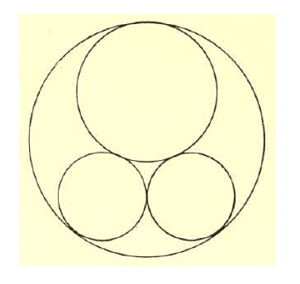 Eine der »unlösbaren« Aufgaben lautet: »In einen Kreis sind drei andere Kreise einbeschrieben; die übrig bleibende Fläche hat 120 Flächeneinheiten. Der gemeinsame Durchmesser der beiden kleinen Kreise ist um 5 Längeneinheiten kleiner als der Durchmesser des dritten Kreises. Welchen Durchmesser haben die Kreise in der Figur?«