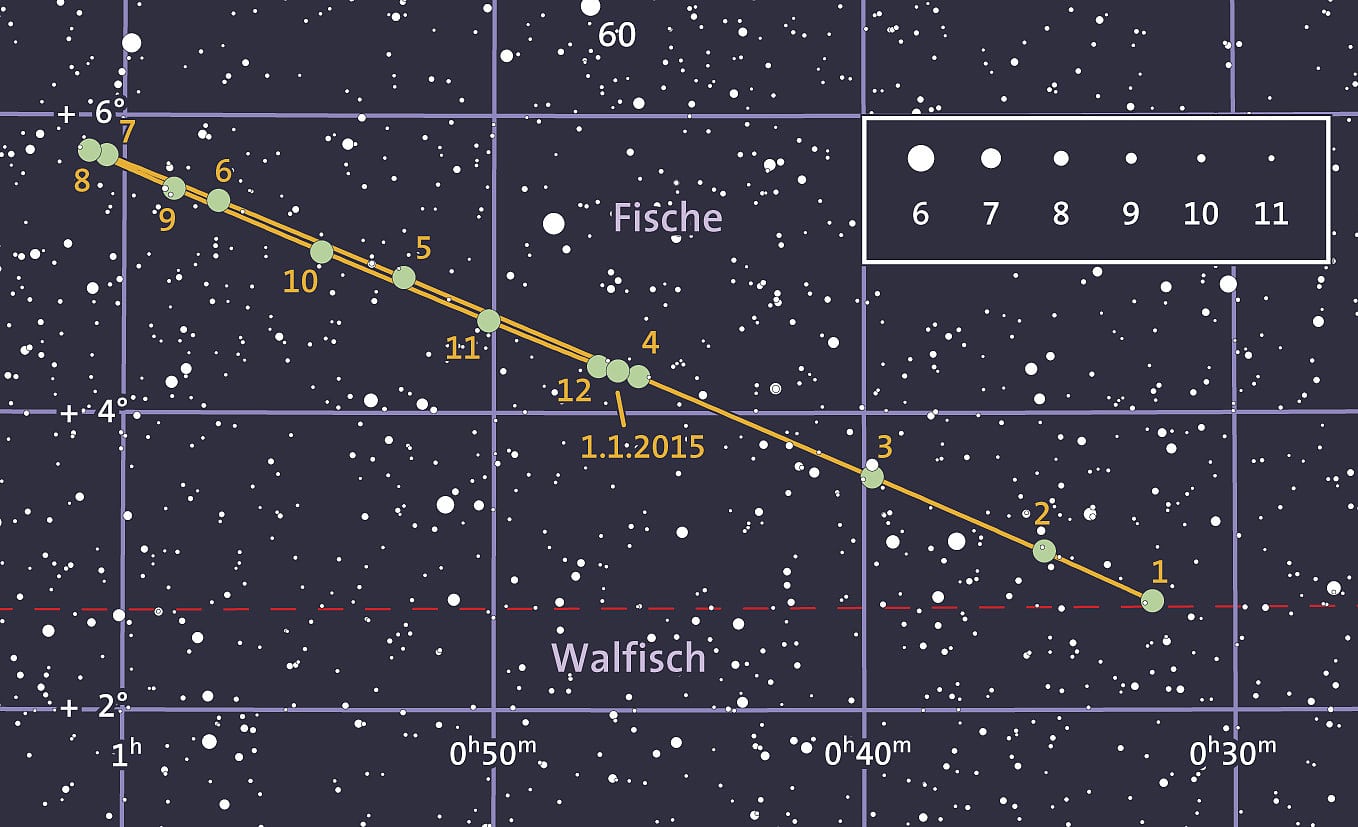 Was meinen Sie: Könnte es sein, dass Menschen früherer Epochen, die aufmerksam den Himmel entlang der Ekliptik beobachteten, auf den sechsten Planeten aufmerksam wurden? Oder ist er einfach zu unauffällig, zu sternähnlich und bewegt sich zu langsam am Himmel? Verschaffen Sie sich selbst einen Eindruck und suchen Sie Uranus einmal mit bloßem Auge auf! In den nächsten Jahren ist die Gelegenheit hierfür besonders günstig, denn er durchwandert eine Region im Sternbild Fische, in der es nicht viele helle Sterne gibt, die bei der Suche stören könnten. Eine Aufsuchkarte, dunkeladaptierte Augen und ein klarer Himmel abseits heller Lichtquellen genügen. Sie werden feststellen: Es ist einfacher als gedacht!