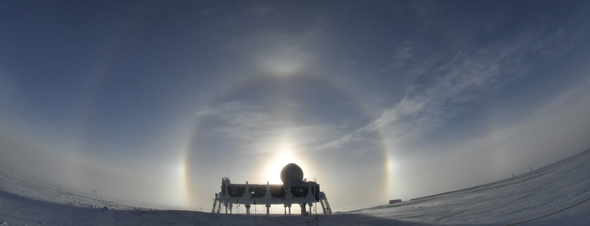 Manchmal bildet sich um die Sonne ein strahlender Leuchtkreis, der so genannte Halo. Solche Phänomene entstehen, wenn in acht bis zehn Kilometer Höhe Eiskristalle langsam und gleichförmig wachsen, beispielsweise in Zirruswolken – das geschieht jedoch meist bloß, wenn sich die Luft nur langsam mit Wasserdampf sättigt. Dann brechen und reflektieren diese wohlgeformten Kristalle das ausgestrahlte Licht, wobei sich ein Ring ausbildet. Wie beim Regenbogen ist dieser oft farbig, doch können auch farblose Halos auftreten, wenn sich das Licht an den Flächen gleichartig orientierter Eiskristalle spiegelt. Und häufig ist der Ring auch unterbrochen, weil die ursächlichen Eiskristalle nicht homogen über den Himmel verteilt sind. Man spricht dann von Halostreifen oder -flecken.
