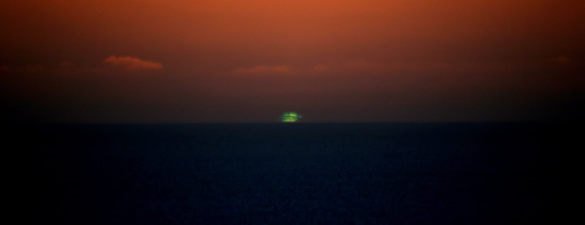 Leider können wir den grünen Blitz heute wegen der Luftverschmutzung nicht mehr überall beobachten, sondern müssen uns dazu auf die hohe See, in Wüsten oder menschenleere Gebirge zurückziehen und bis zum Sonnenuntergang warten. Wenn unser Zentralgestirn am Horizont versinkt, wird ihr Licht durch die Lufthülle am stärksten gebrochen. Diese Refraktion spaltet das Licht mit zunehmender Stärke in die drei Farben Rot, Grün und Blau auf, die einen Rand an der Oberseite des Sterns bilden. Zuerst geht die »rote« Sonne unter, während der grüne und blaue Rand noch für sehr kurze Zeit über dem Horizont liegen. Da die Atmosphäre das blaue Licht so stark abschwächt und streut, bleibt es quasi unsichtbar und erscheint nur bei extrem klaren Bedingungen. Das grüne Licht kann unser Auge allerdings noch wahrnehmen – als kurzen, meist nur wenige Sekunden andauernden grünen Blitz.