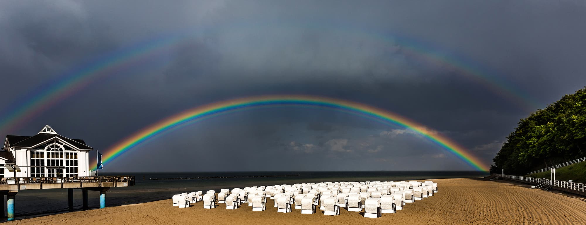 Regenbogen sind sicherlich die bekanntesten Leuchterscheinungen am Himmel, doch bergen auch sie noch Überraschungen. Denn sie können auch als Doppel-, Dreifach- oder, im extrem seltenen Fall, sogar als Vierfachregenbögen auftauchen. Im einfachen Fall beleuchtet die Sonne eine Regenwand, so dass sich der Sonne gegenüber die farbigen Streifen bilden: Das einfallende Licht wird von den kugelförmigen Tropfen beim Ein- und Austritt gebrochen, in deren Innerem reflektiert und in seine Spektralfarben zerlegt. Ein kleiner Teil des Lichts verlässt den Tropfen allerdings erst nach zweimaliger Reflexion, so dass oberhalb des Hauptbogens ein zweiter, schwächerer Nebenbogen auftritt, dessen Farbreihenfolge sich zudem umkehrt. Dieser verliert noch an weiterer Leuchtstärke, weil es sich dabei um Licht handelt, das sehr flach in die Tropfen ein- und austritt – er ist also nur bei günstigen Lichtverhältnissen sichtbar. Das gilt erst recht für Dreifach- und weitere Mehrfachbögen, die immer lichtschwächer werden, so dass bislang maximal Vierfachbögen fotografisch dokumentiert werden konnten.