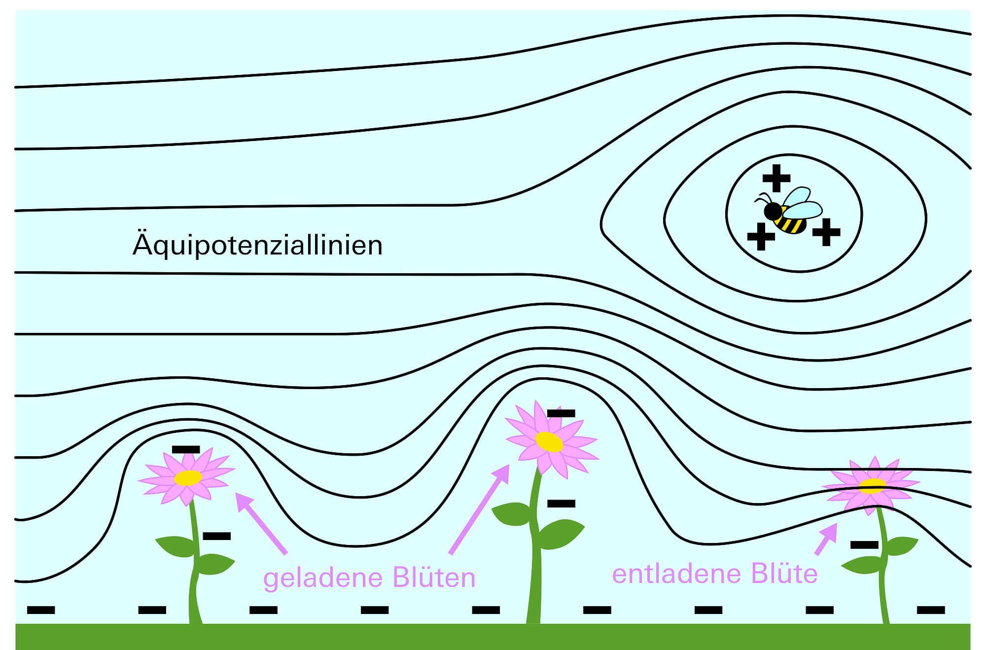 Viele Blüten tragen eine leicht negative elektrische Ladung. Das liegt am ständigen Spannungsunterschied zwischen Himmel und Erdoberfläche. Die geerdete Blume reicht die negative Ladung des Bodens gewissermaßen in die Höhe weiter. Dagegen sind manche Insekten wie die häufig vorkommende Dunkle Erdhummel (Bombus terrestris) elektrisch positiv geladen, weil es während ihres Flugs zu Reibungseffekten kommt. Dieses Phänomen der so genannten Triboelektrizität hat wohl jeder schon am eigenen Leib erfahren, etwa bei einem metallenen Türgriff, den man nach einem Gang über einen Teppich aus Kunststofffasern anfasst.